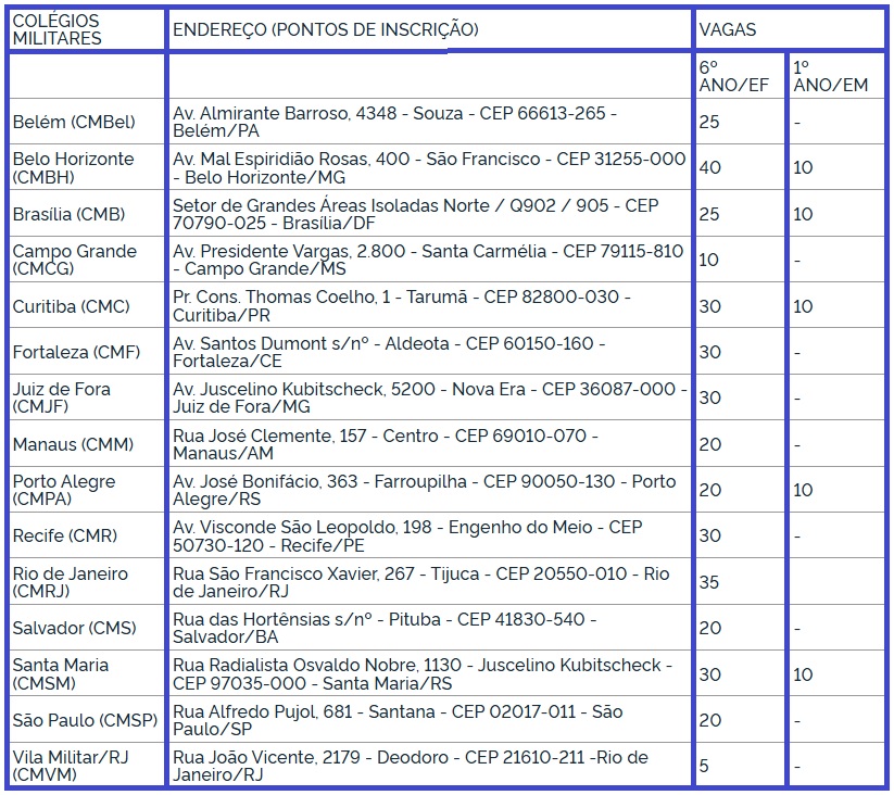 Com taxa de R$ 95, as inscrições devem ser efetuadas no site do colégio militar de interesse. No caso de pessoas com deficiência, é necessário registrar a candidatura presencialmente. Os endereços são os seguintes: